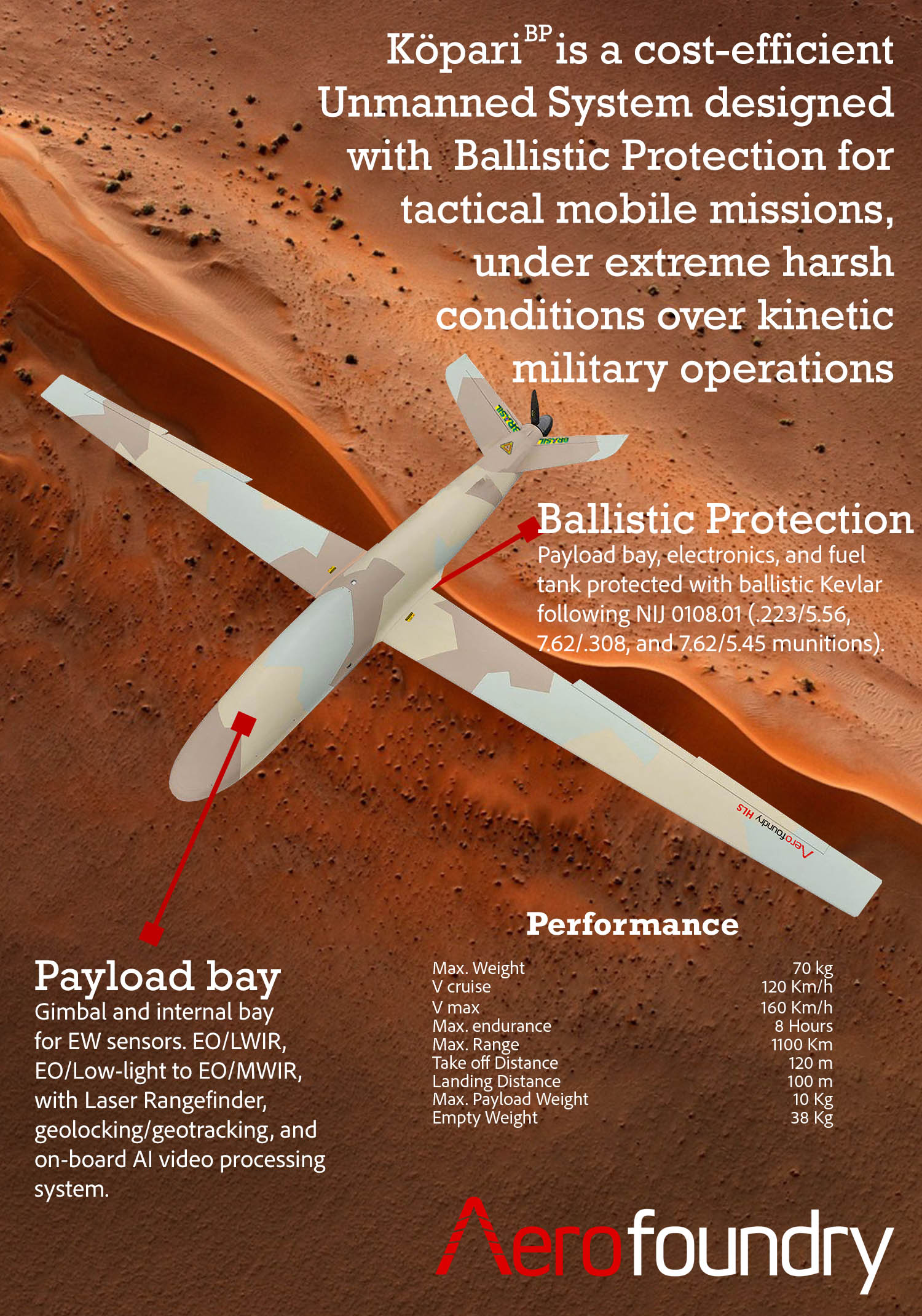 A Köpari 400 for active battlefield ISR, configured with underbelly ballistic protection for payload, electronics, engine, and fuel tank. This Köpari version carries a gimbal (EO/LWIR) integrated with a long-range laser rangefinder (LRF)and Laser Target Pointer (LP), with a range of <5km. This configuration ensures an endurance of <14 hours, with a datalink safe range of 80km (capable of 100km range).