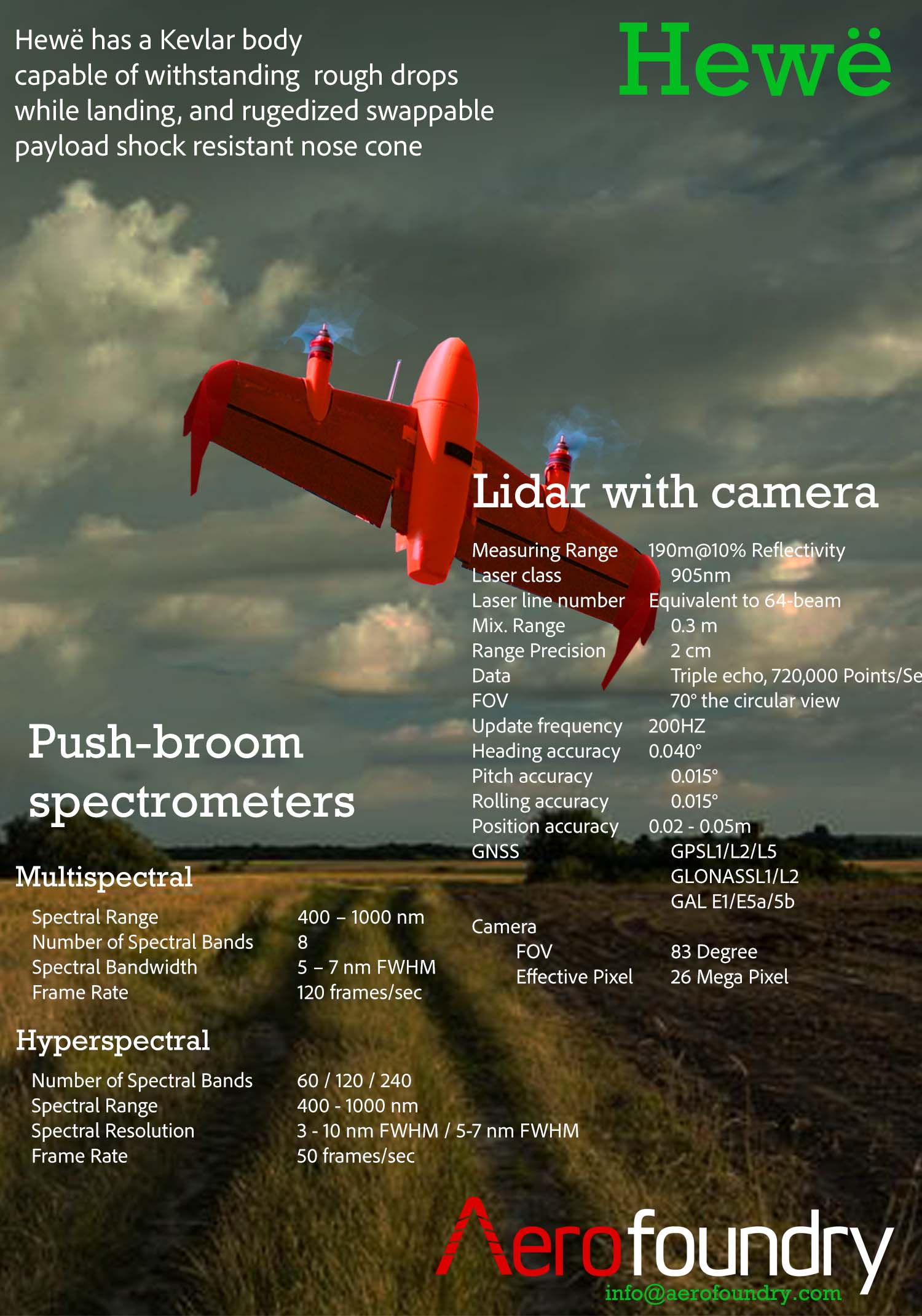 Its nose cone detachable payload compartment is spacious enough to carry delicate sensors like Lidar, or sensitive ordinance for dropping or nose diving precisely to the target.